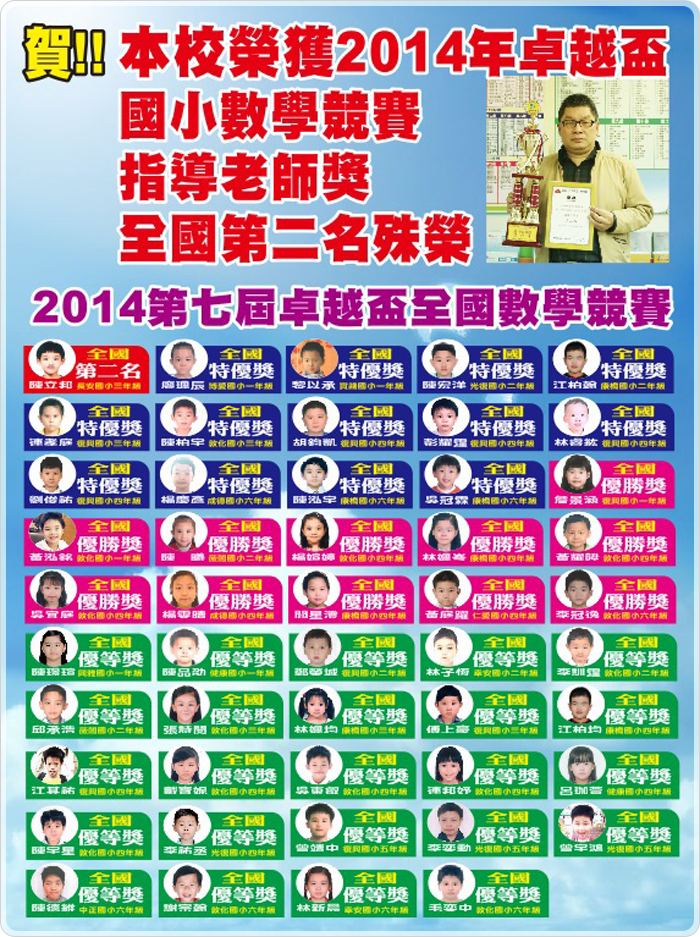 - 2015年第八屆卓越盃全國數學競賽勇奪全國第一名