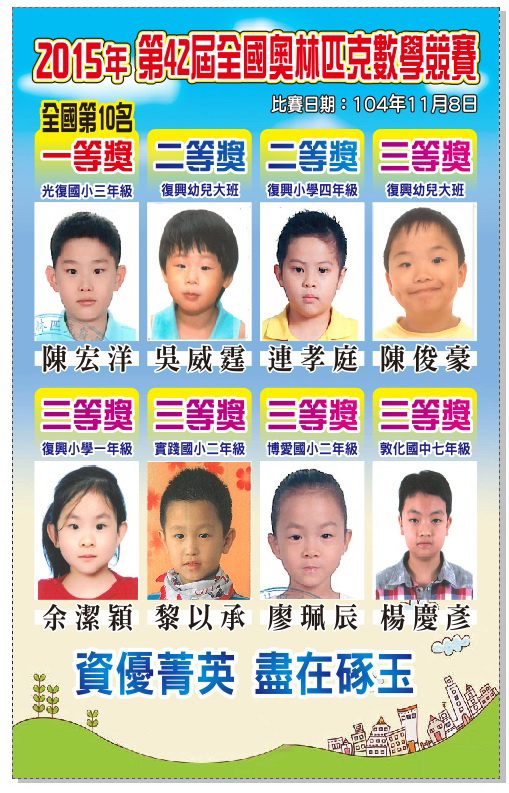 - 2015年第八屆卓越盃全國數學競賽勇奪全國第一名