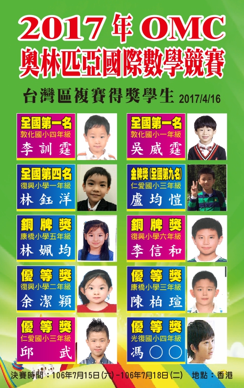 2017年OMC奧林匹亞國際數學競賽台灣區複賽得獎學生名單