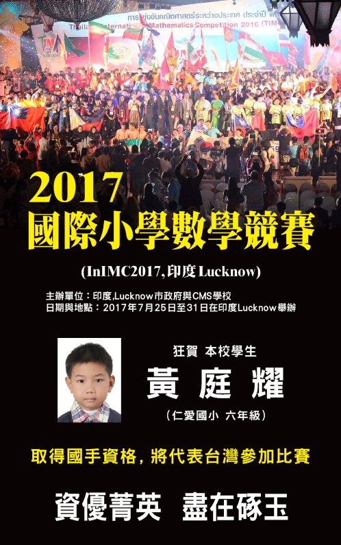 狂賀!!本校黃庭耀同學取得InIMC2017國手資格