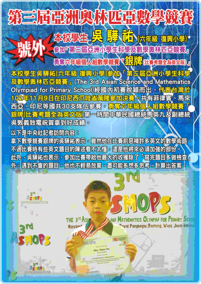 - 狂賀!本班學生參加【第九屆亞洲奧林匹亞數學暨科學競賽】獲得2銀!!!