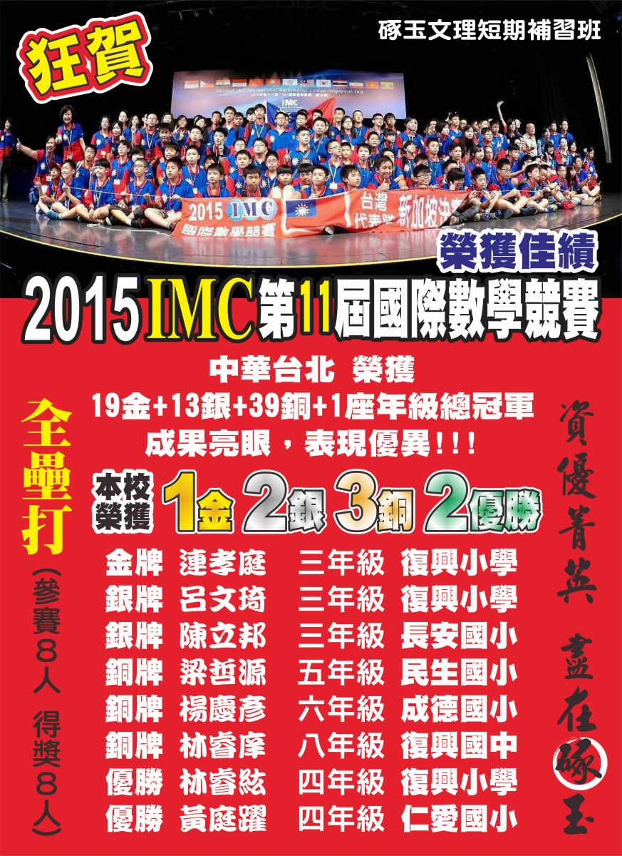 - 狂賀!本校參加2015IMC新加坡第十一屆國際數學競賽,榮獲1金2銀3銅2優勝!