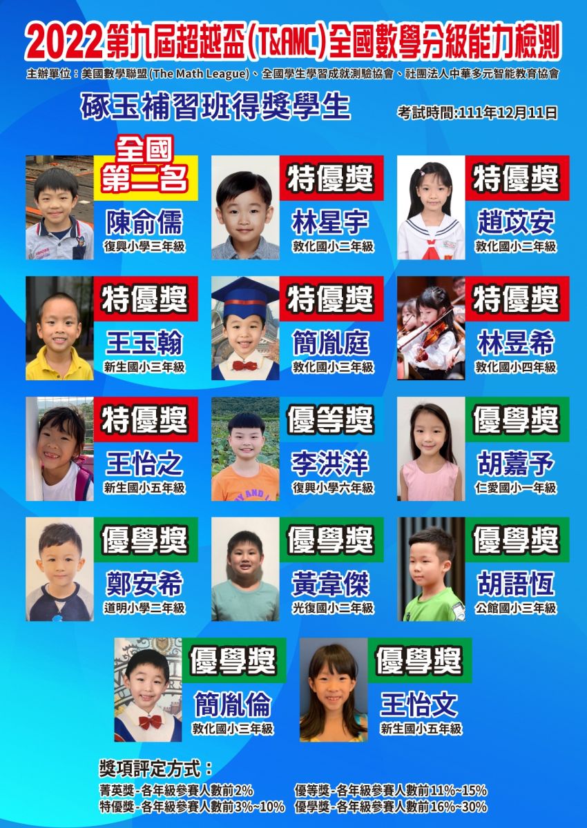 狂賀!本校學生參加2022第九屆超越盃(T&AMC)全國數學分級能力檢測成績優異 !!!